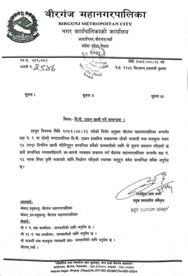 बिरगंज महानगरपालिकाले घण्टाघरस्थित वि.पी उद्यानको जग्गा खाली गर्न १५ दिने नोटिस जारी