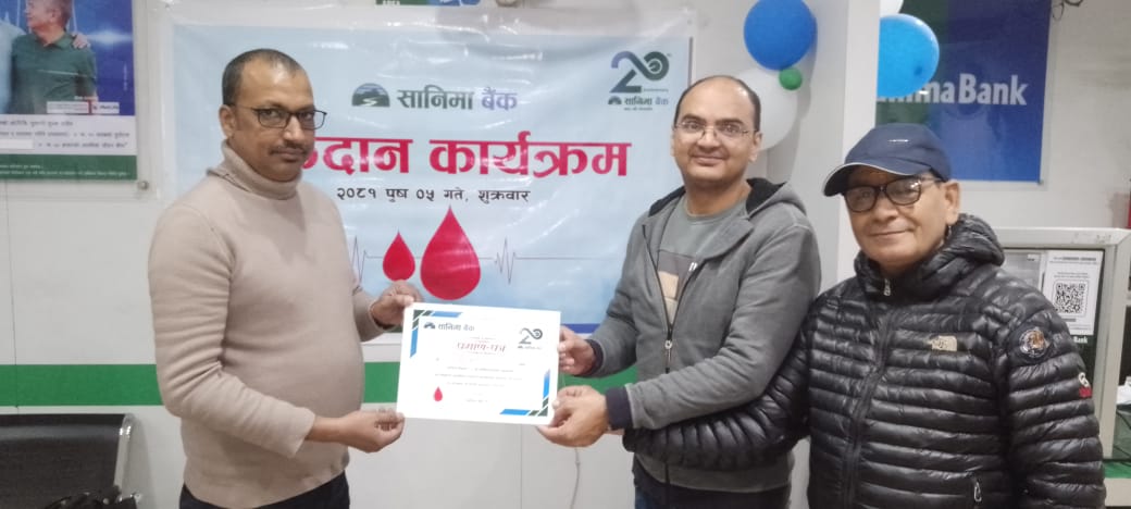 बिरगंज स्थित सानिमा बैंकको २० औं स्थापना दिवसको अवसरमा आयोजित रक्तदान कार्यक्रम सम्पन्न