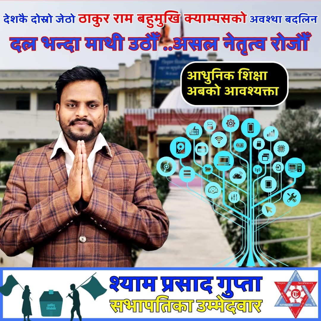 विधार्थी समस्या समाधानका लागि ठाकुर राम क्याम्पसकाे स्ववियु निर्वाचनमा सभापति पदकाे प्रत्याशी उम्मेद्वार : श्याम प्रसाद गुप्ता