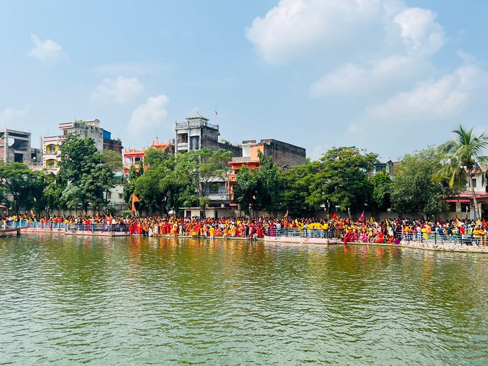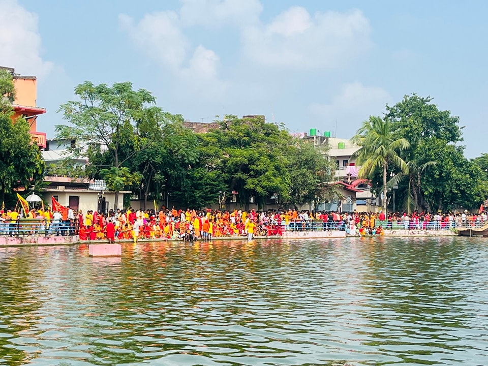 नवरात्राका पहिलो दिन वीरगन्जका विभिन्न टोलबाट निकालिएको कलश यात्रा घडीअर्वा पोखरीमा पुग्दा देखिएको दृश्य ।