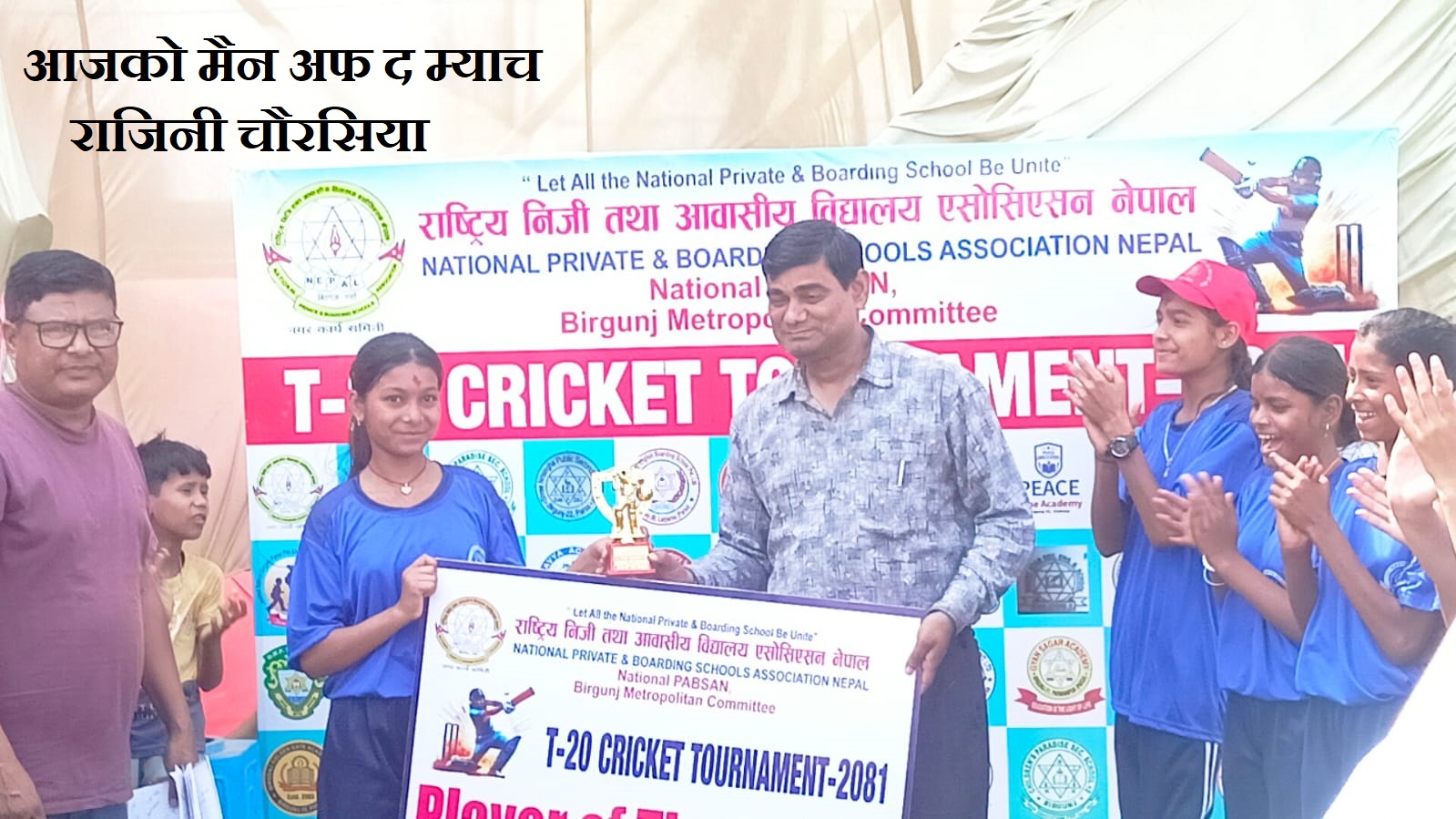 नागरिक न्युज देस्क,चैत्र २६, वीरगञ्ज : नारायणी रङ्गशालामा राष्ट्रिय निजी तथा आवासीय विद्यालय एसोसिएसन नेपाल (नेशनल प्याब्सन) वीरगञ्ज महानगरको आयोजनामा जारी टी–२० महिला तथा पुरुष क्रिकेट प्रतियोगिताअन्तर्गत आजको खेलमा काव्या एकेडेमीको गर्ल्स टिमले वीरगञ्ज गोल्डेन गेटलाई पराजित गर्दै शानदार जित हासिल गरेको छ ।