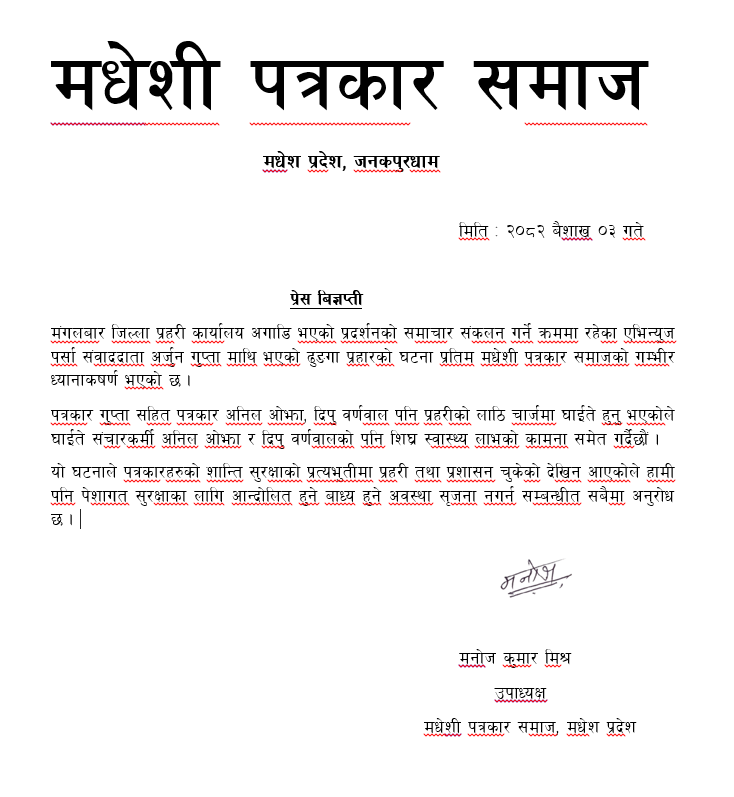 महासंघका सचिव बिजय महतोले लिखितरुपमा प्र.जि.अ गणेश अर्याललाई ध्यानाकषर्ण पत्र प्रदान गर्नु भएको थियो । टोलिमा महिला उपाध्यक्ष निलिमा पौडेल,कोषाध्यक्ष संजिव कुमार मिश्रलगायतको सहभागीता रहेको थियो । मंलबार साँझ जिल्ला प्रहरी कार्यालय पर्सा अगाडि प्रदर्शकारीको ढुङगा लागि पत्रकार अर्जुन गुप्ता । अनिल ओझ घाईते भएका थिए । प्र.जि.अ अर्याले घाईते पत्रकारहरुको स्वास्थ्य लाभको कामना गर्नु भएको छ । यसै बिच मधेशी पत्रकार समाजले एक बिज्ञप्ती मार्फत हिजो घटनाको निन्दा गरेको छ । समाजका मधेश प्रदेश उपाध्यक्ष मनोज कुमार मिश्रले जारी गरेको बिज्ञप्तीमा समाचार संकलनको क्रममा भएको घटनामा राज्य संचारकर्मीको सुरक्षामा गम्भीर नरहेको भनिएको छ । यस प्रकारको गतिबिधि नरोकिए पेशागत रक्षाका लागि आन्दोलनमा जाने उपाध्यक्ष मिश्रले चेतावनी दिएका छन ।